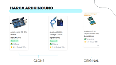 Perbedaan paling mencolok antara Arduino original dan non-original adalah harga, dimana dilihat dari Arduino.cc, harga Arduino varian Uno R3 itu sekitaran $27,6, atau dalam mata uang rupiah pada saat ini berkisar Rp 409584. Untuk harga dollar itu sendiri dapat berubah rubah seiring waktu. namun jika kalian ingin membeli Arduino, dan harga Arduino itu dibawah Rp300000, maka 100% dapat diklasifikasikan bahwa Arduino tersebut non-original atau klon.